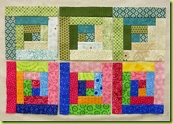 I got a water bottle with Crystal Lite packages to put in it, a small journal with graph paper – great to carry in my purse for quick sketches of quilt ideas. Chocolate covered edamame, green note cards, a green mug with Chai tea to have in it, sea salt chocolate and dark chocolate Chex mix. Lots of yummy things. The best is the small quilt/mug rug she made for me. I love it!