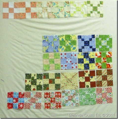 The above blocks are the homework from last week – rail fence blocks. Next is a few more that were completed after I took the first photo.