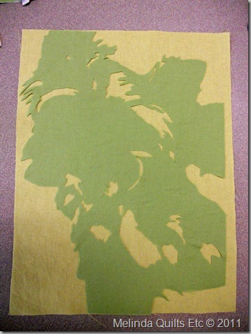 We used four values of a single color. I chose green. Here is the base fabric with the first layer added.