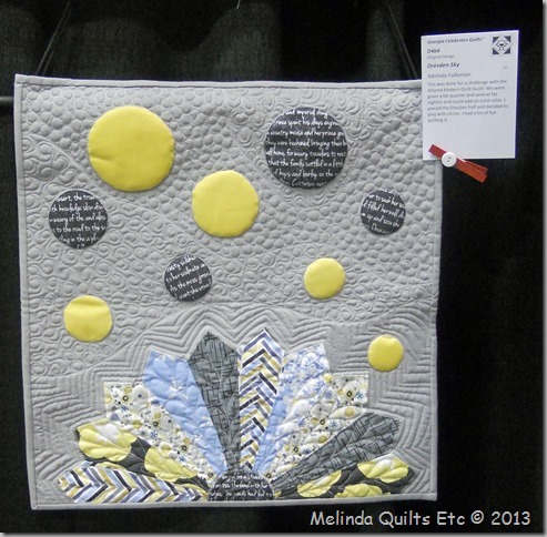 Thought I would share a few quilts from the show over the next few days. First I finally took a photo of my third quilt that was in the show. This was made for a guild challenge and I named it Dresden Sky.